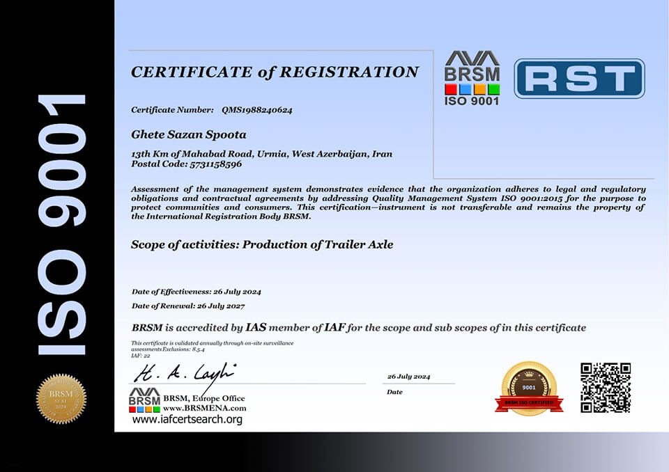 شرکت قطعهسازان به عنوان تولیدکننده قطعات محور و زیربندی تریلر، با دریافت گواهینامه ISO 9001 نشان داده است که نظام مدیریتی خود را بر اساس استانداردهای بینالمللی مدیریت کیفیت سازماندهی کرده است.